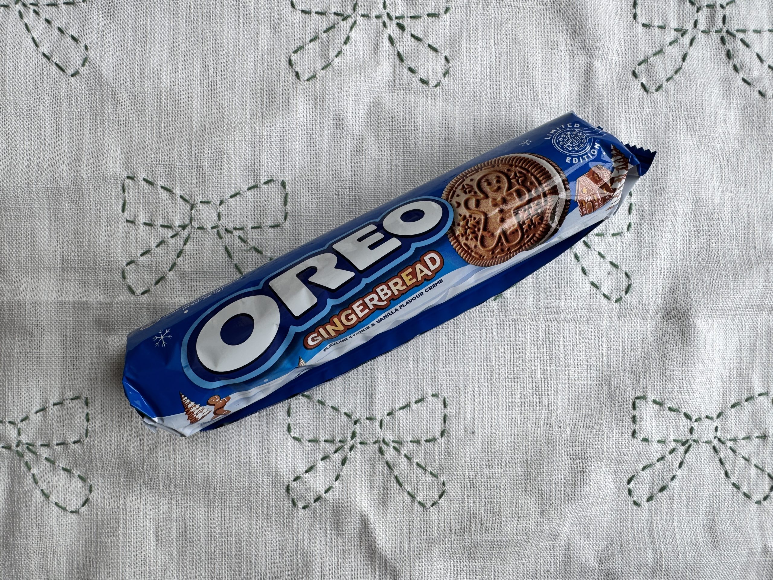 Limited edition Oreo gingerbread flavour cookie and vanilla flavour creme. From all good supermarkets, priced £1.00