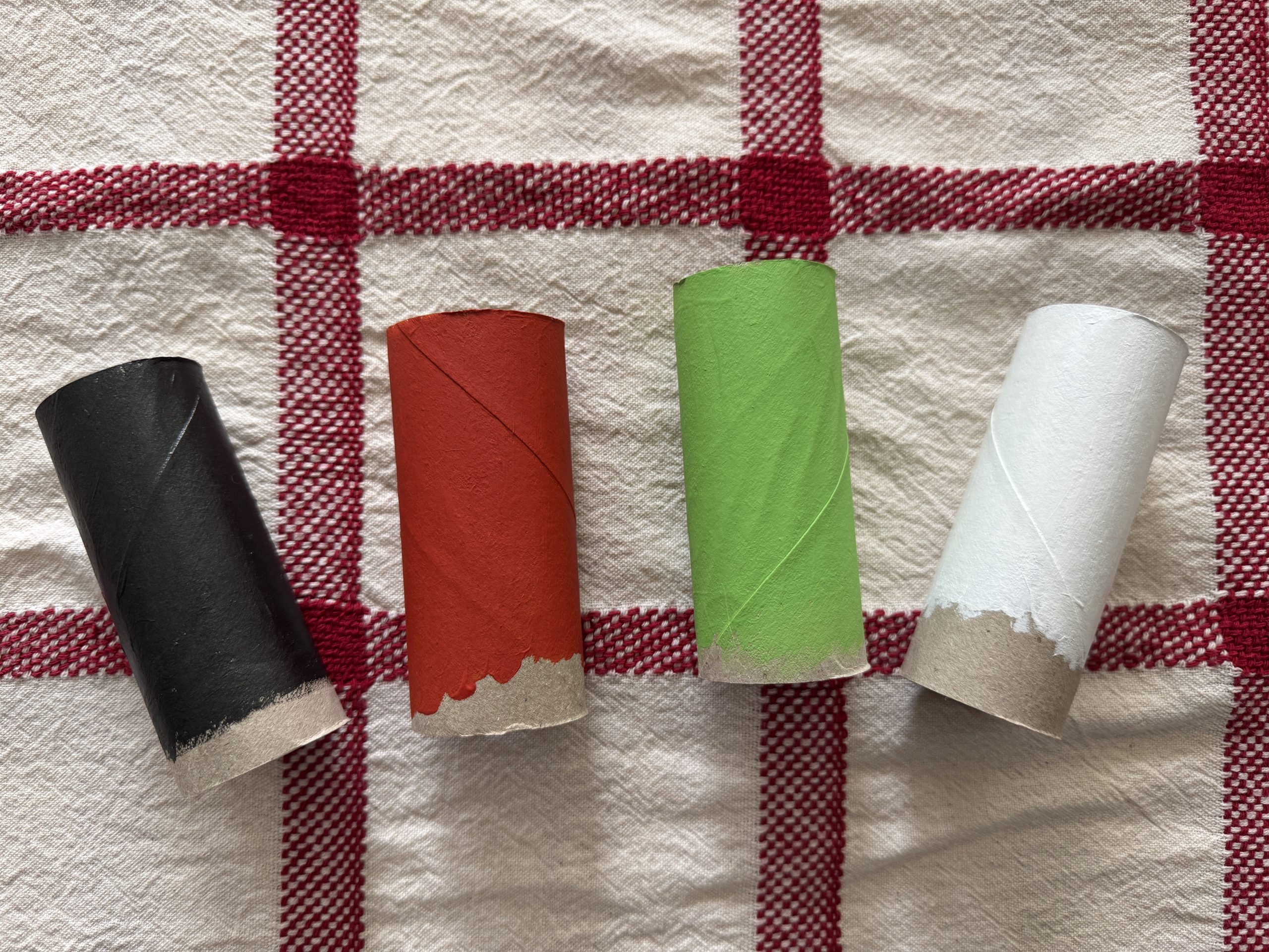 First we painted the cardboard tubes, leaving the bottom as we knew we would need to cut the cardboard tubes. We set them aside to dry, and gave them a second coat of paint.