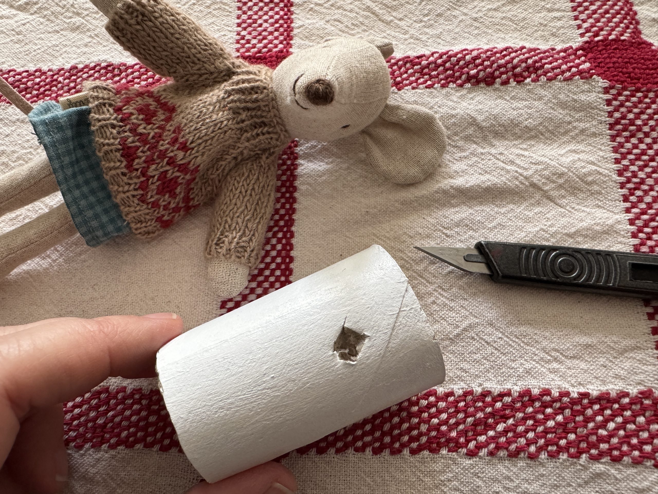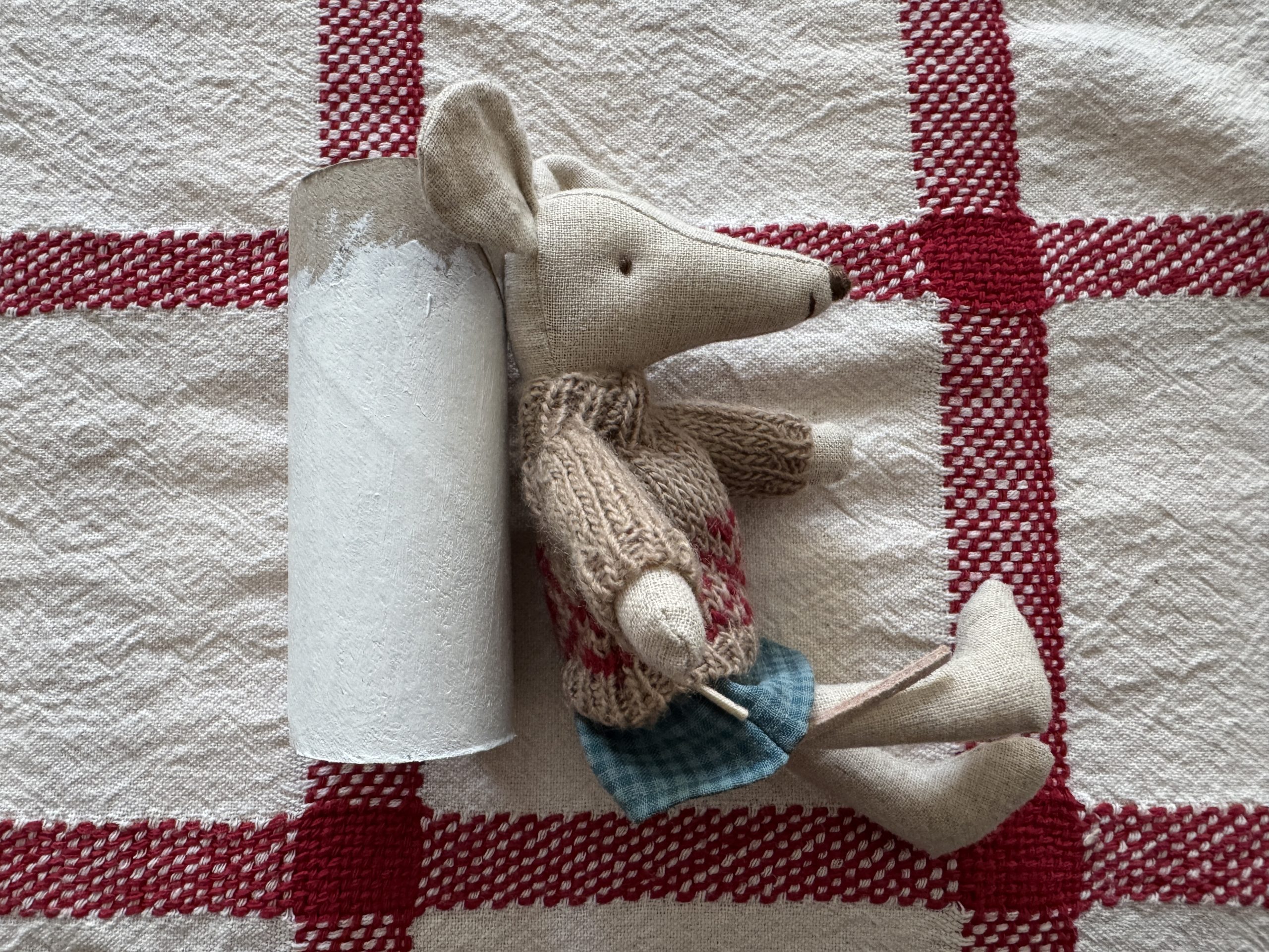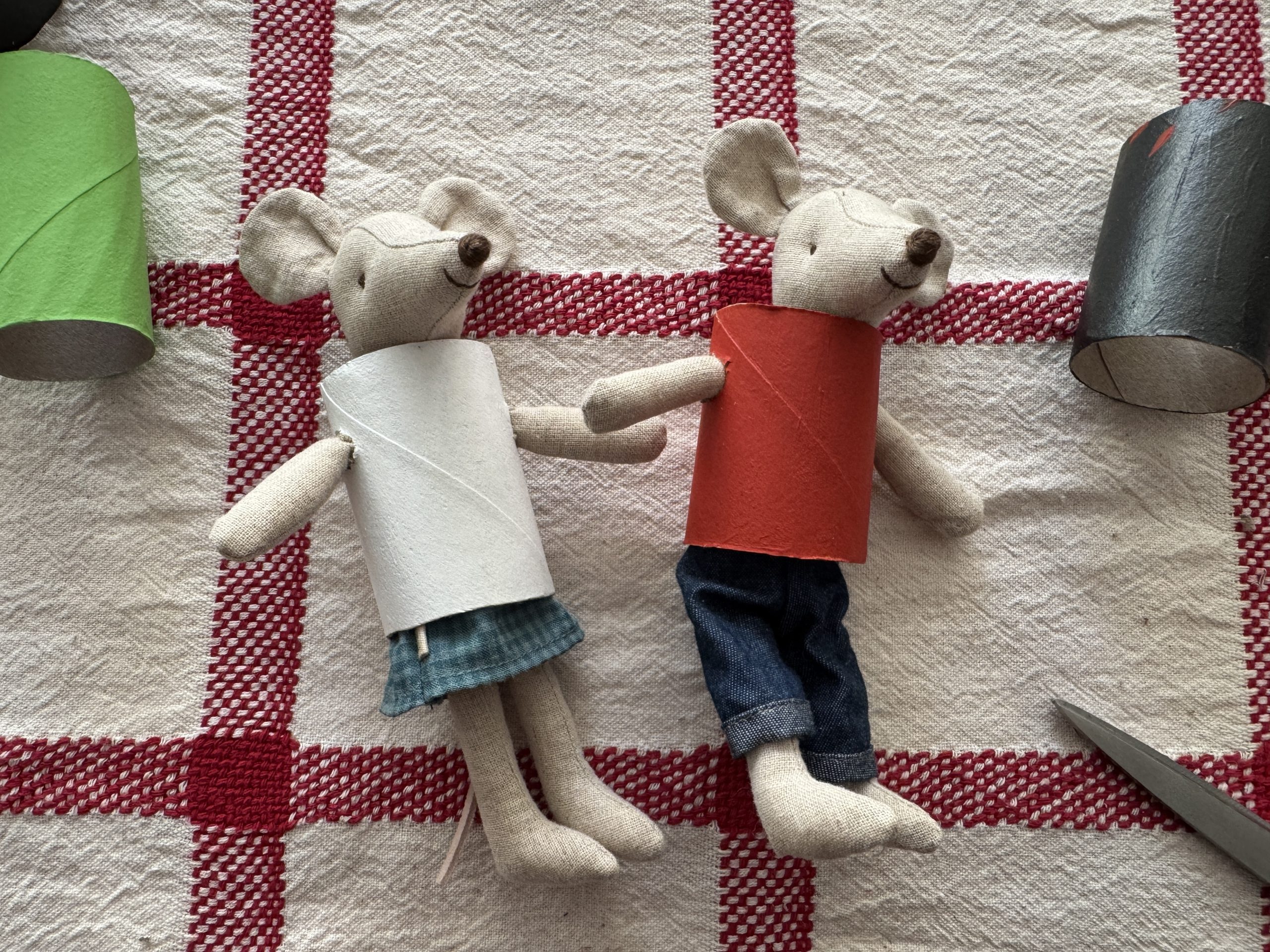 We left the lower half un-painted as we knew we would need to cut the cardboard tubes. We placed our mice next to the tube and made a small mark so we knew where to cut. Then we trimmed the cardboard tube to the size of each mouse.