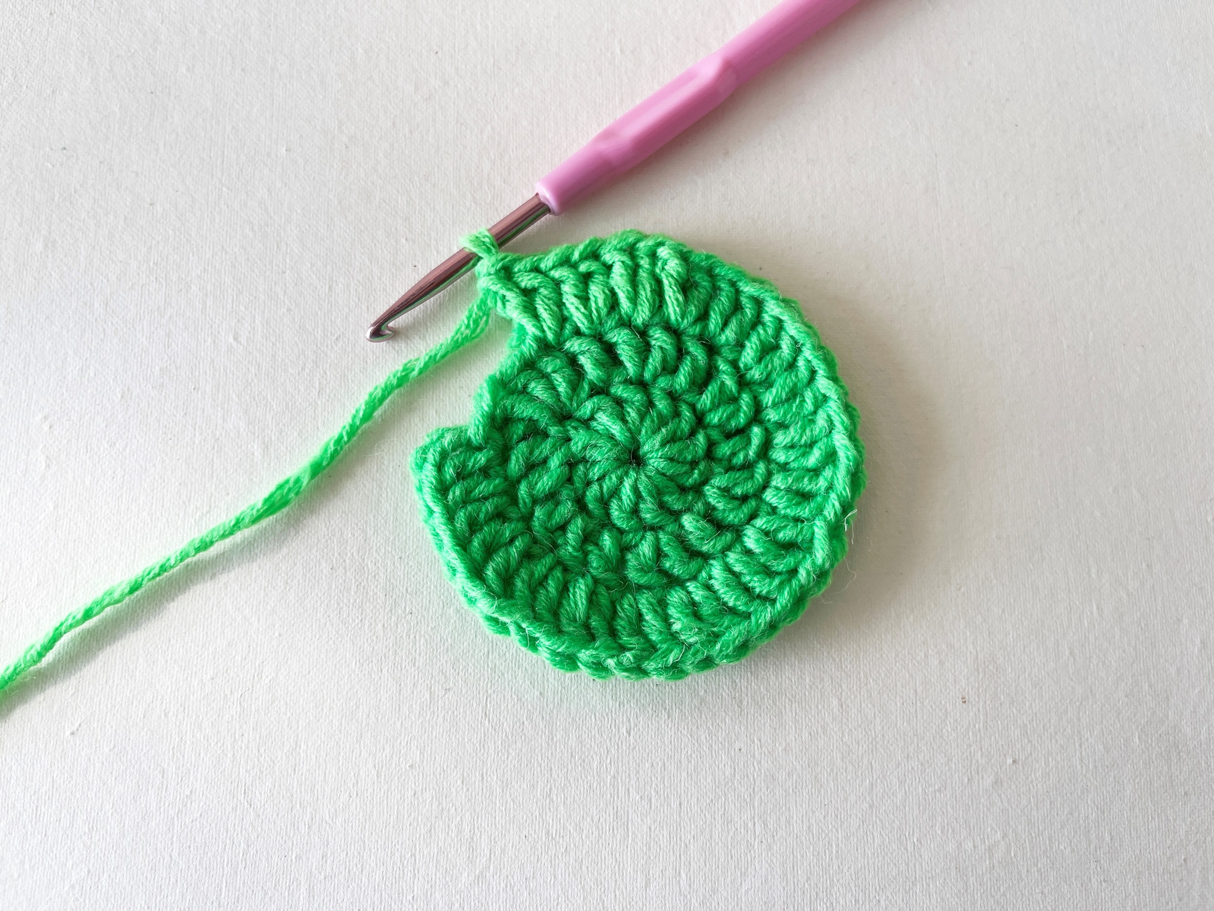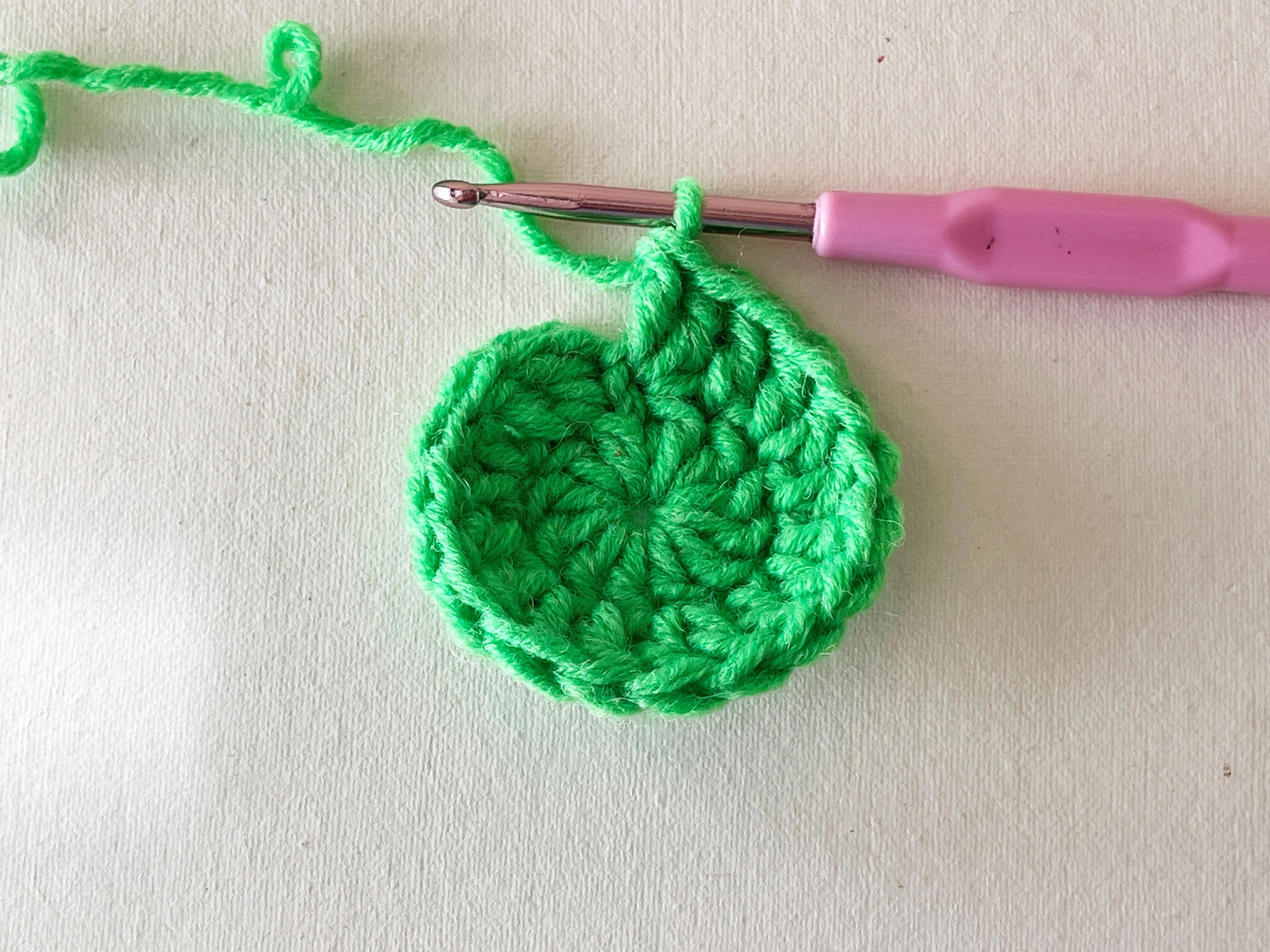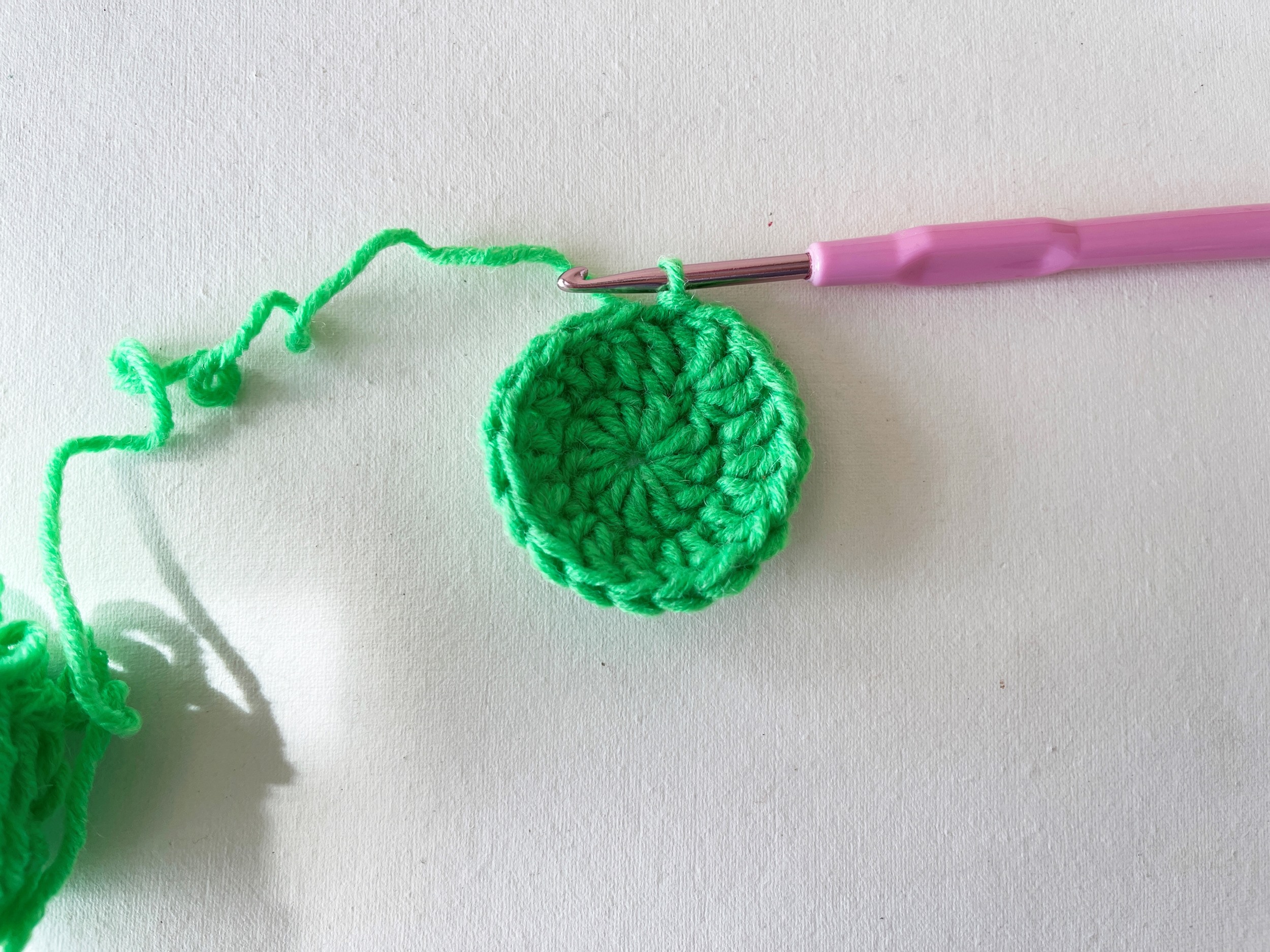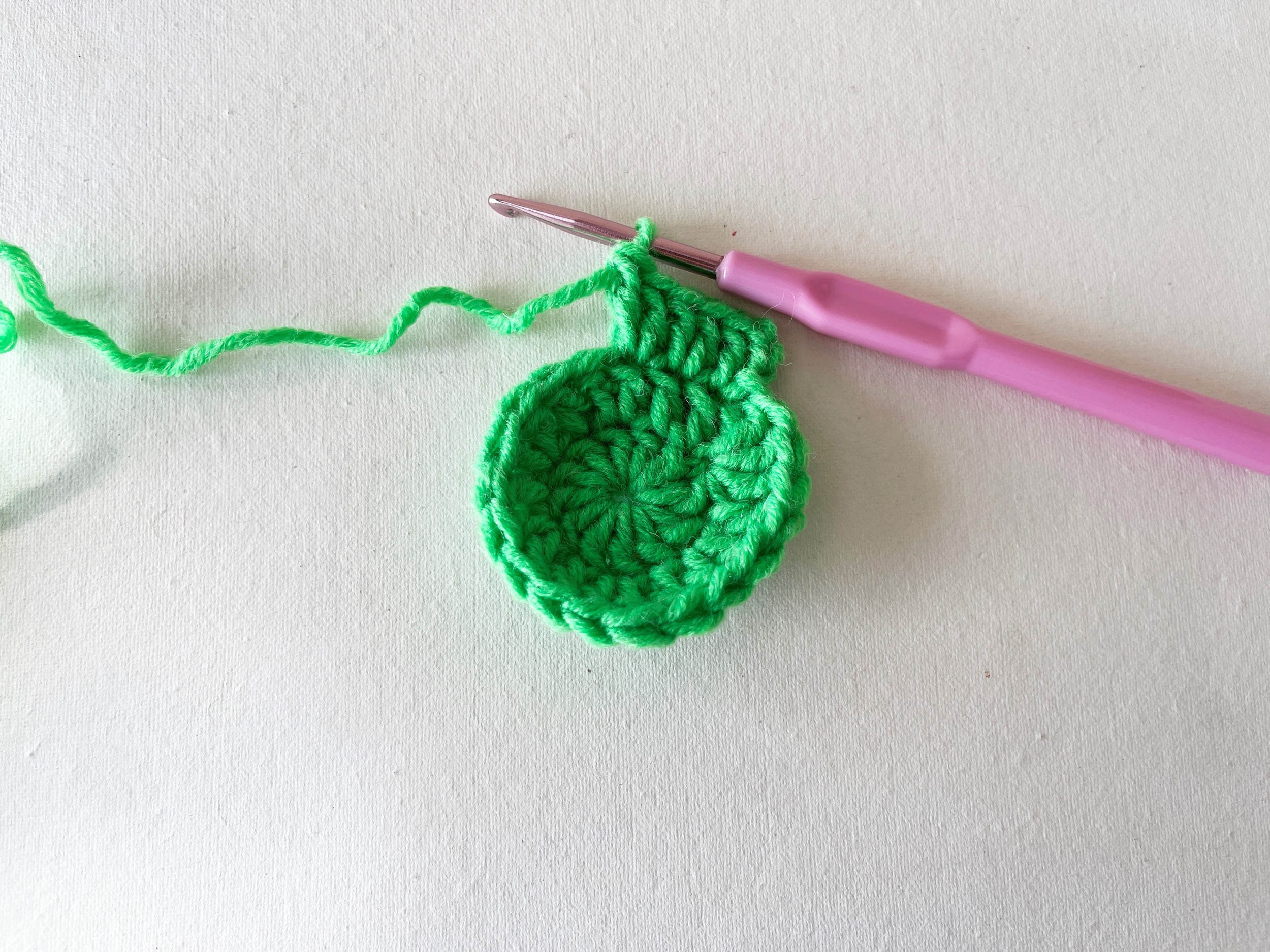 Work a single crochet through the chain stitch near the hook. Work 2 single crochet through each chain stitch of round 2.