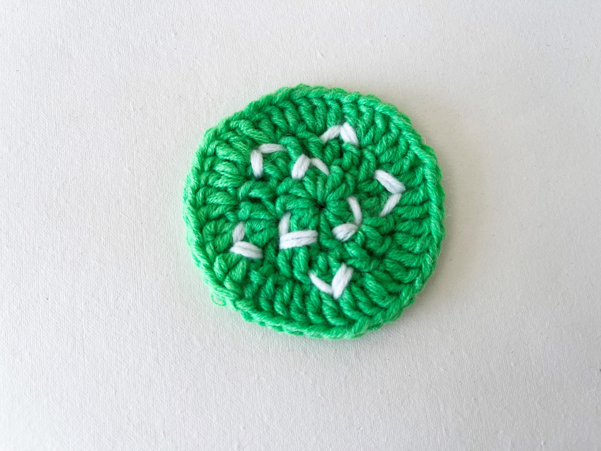 Simply work some arrow-patterns around the centre and border of the crochet cactus pattern. Secure the yarn on the backside of the crochet pattern after you’re done.