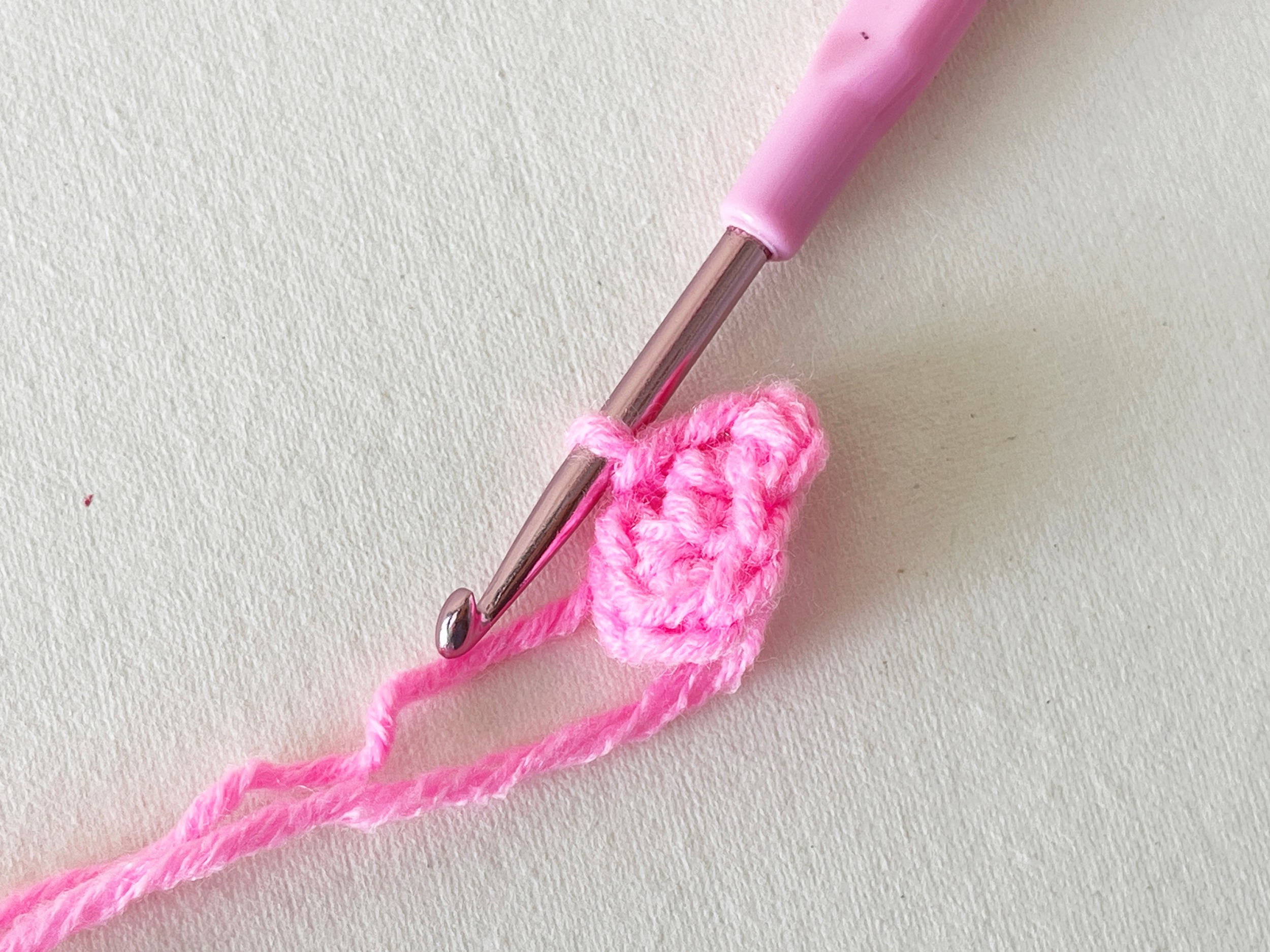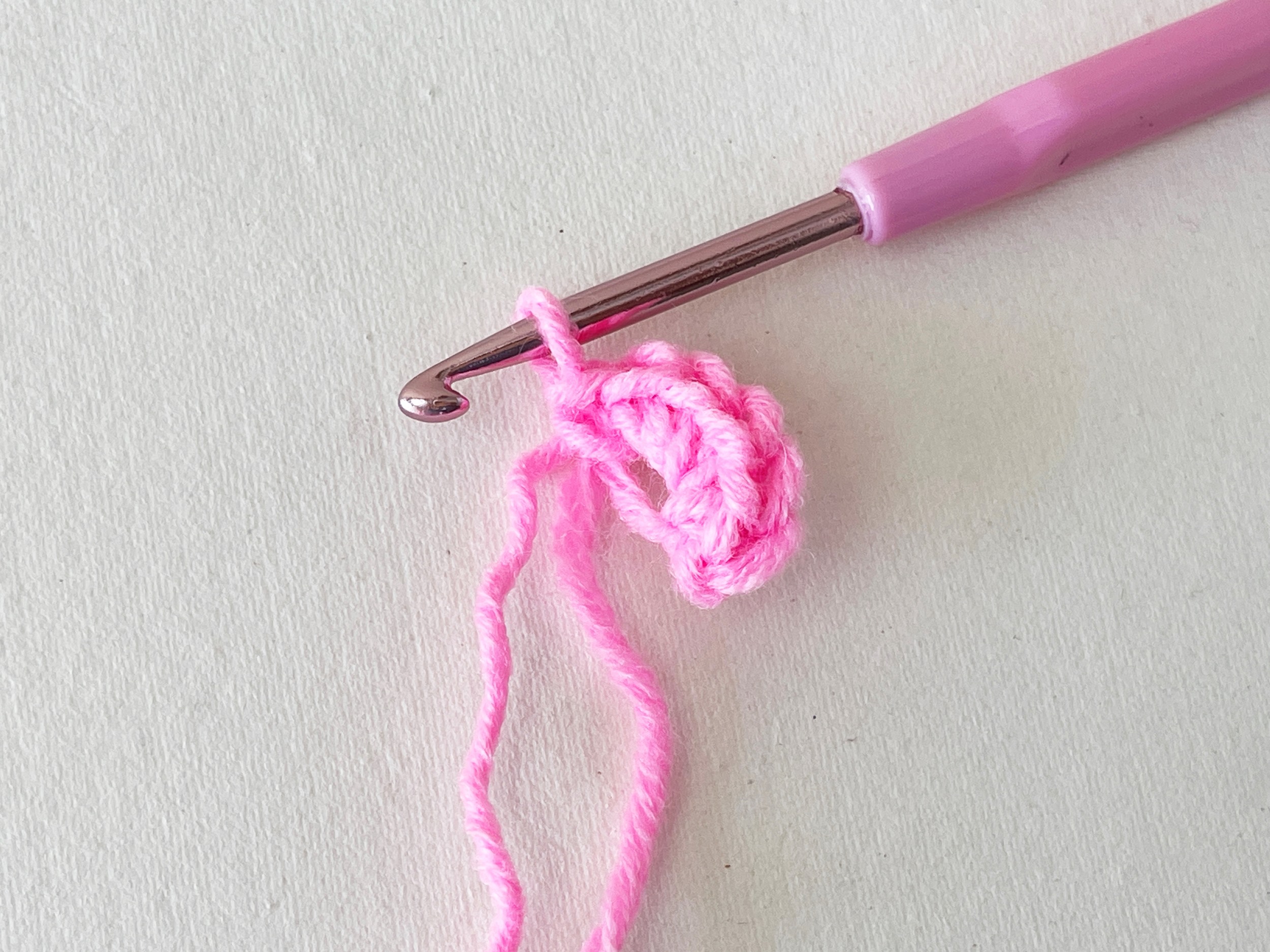 Work 1 single crochet, 1 double crochet, 1 single crochet and a slip stitch through the chain near the hook.