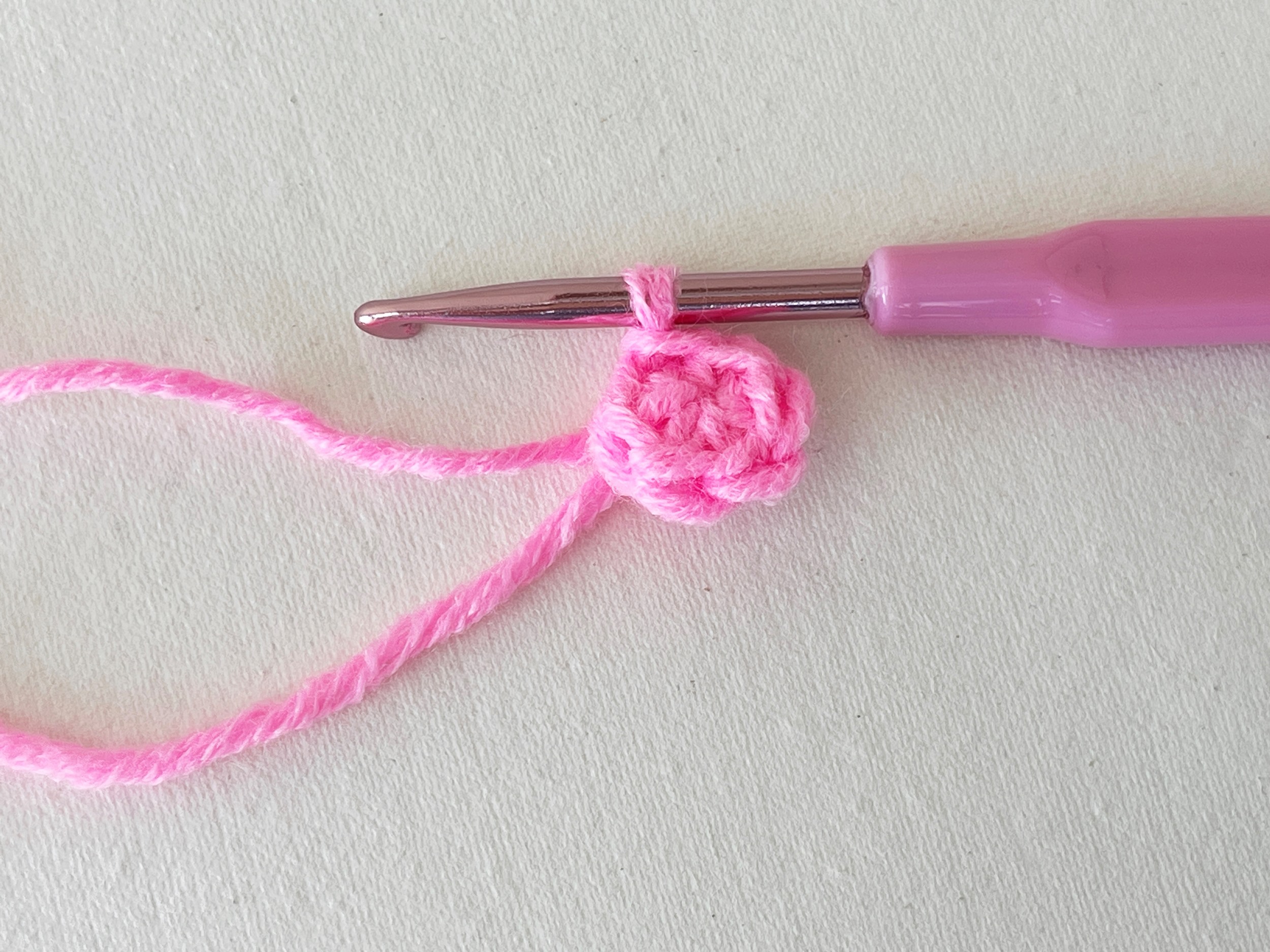 Chain one on hook to secure the magic ring. We will count this as the first SC (single crochet) of this round.