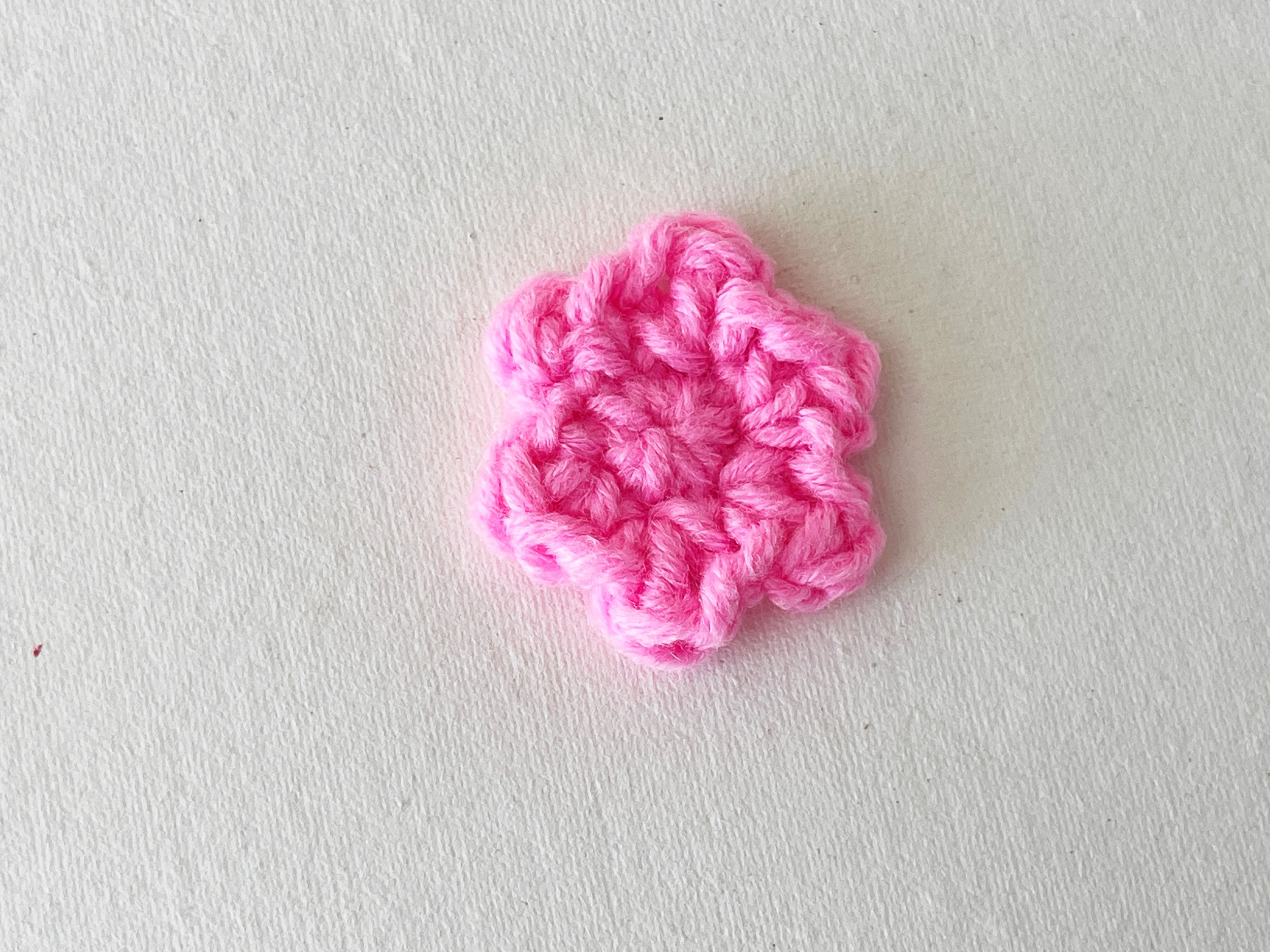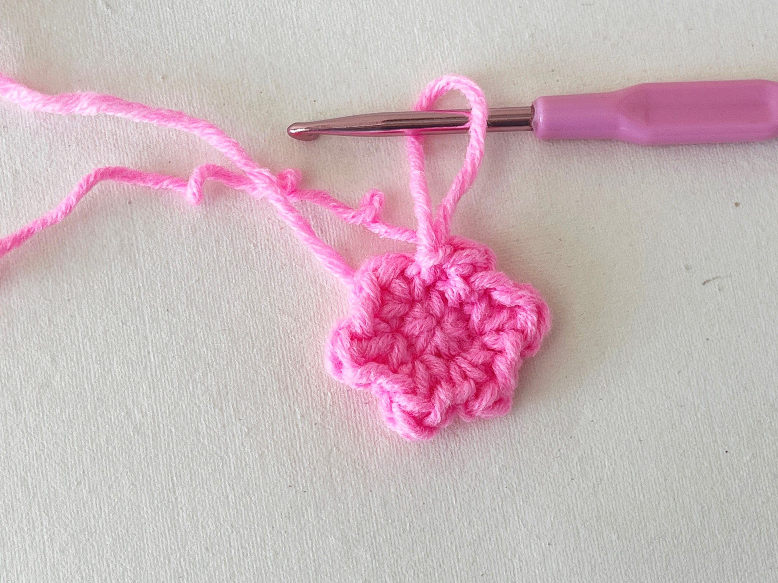 Start the next petal with a slip stitch through the next chain. Repeat 1 sc, 1 dc, 1sc and 1 slip stitch to make the 2nd petal. Pull out the yarn by a few inches after completing all 6 petals.