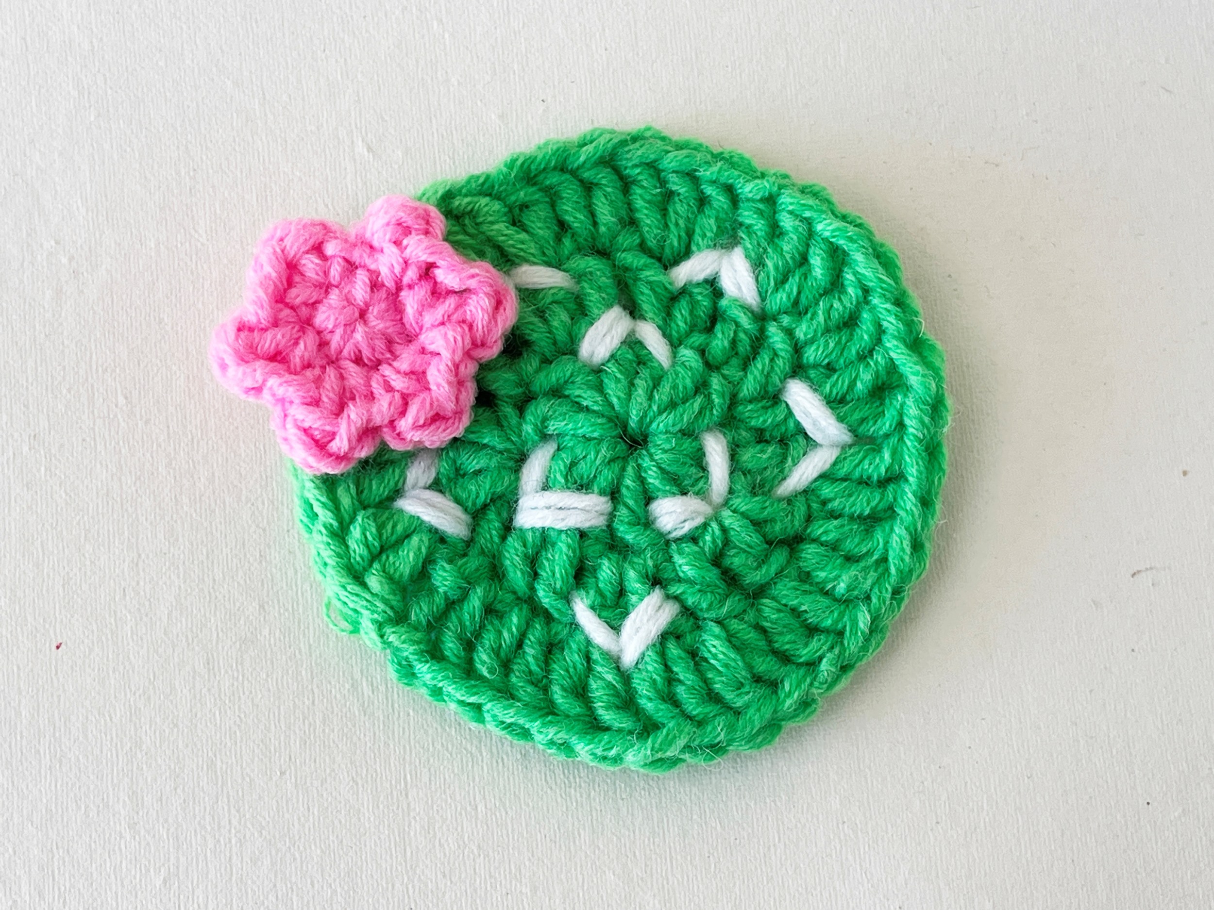 Stitch the crochet flower with the crochet cactus coaster on a side to complete the craft.