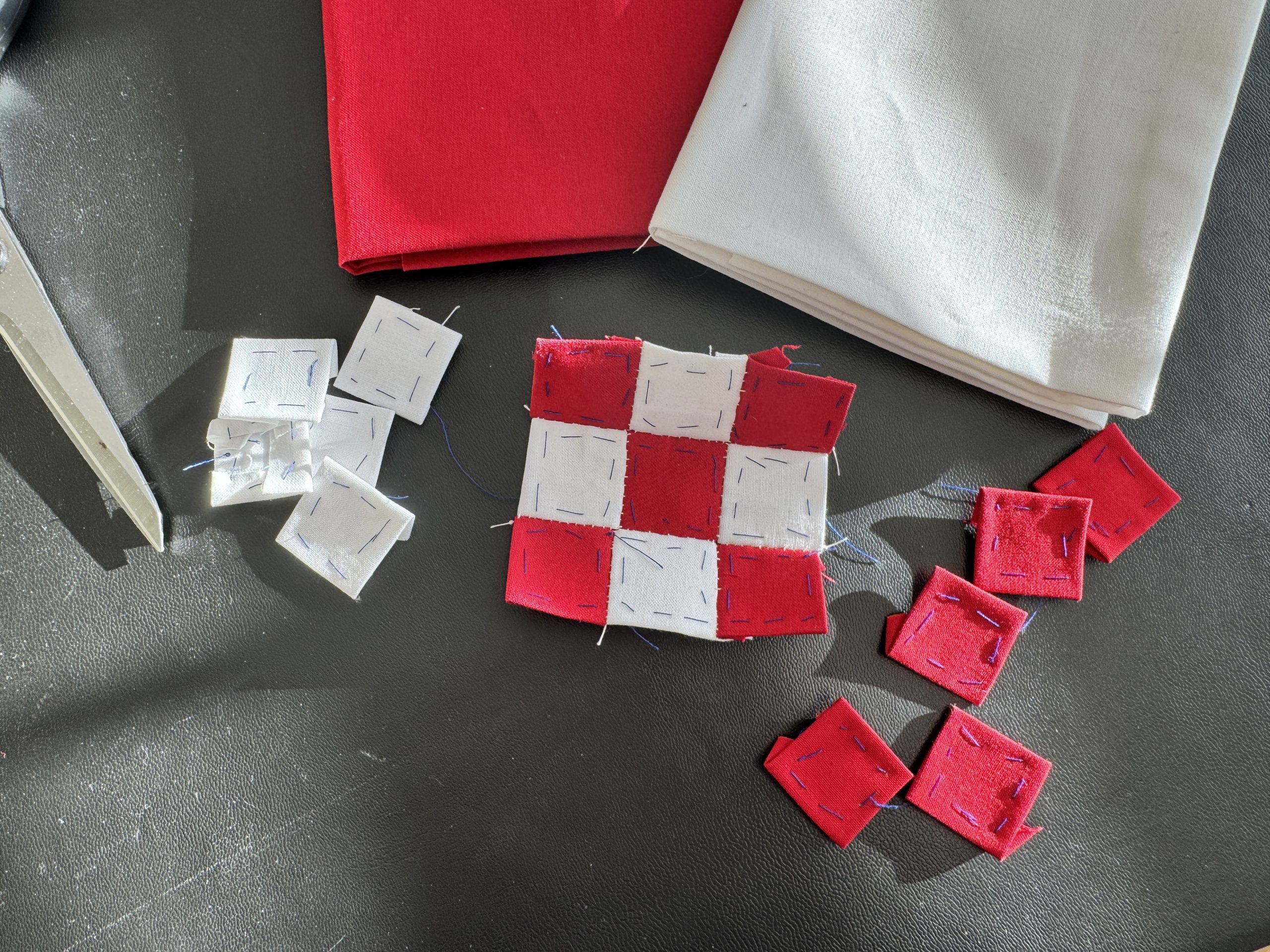 Join squares one at a time until you have the central block: red/white/red for the first row; white/red/white for the second row; red/white/red for the third row. When you have the three rows hand stitch them together.